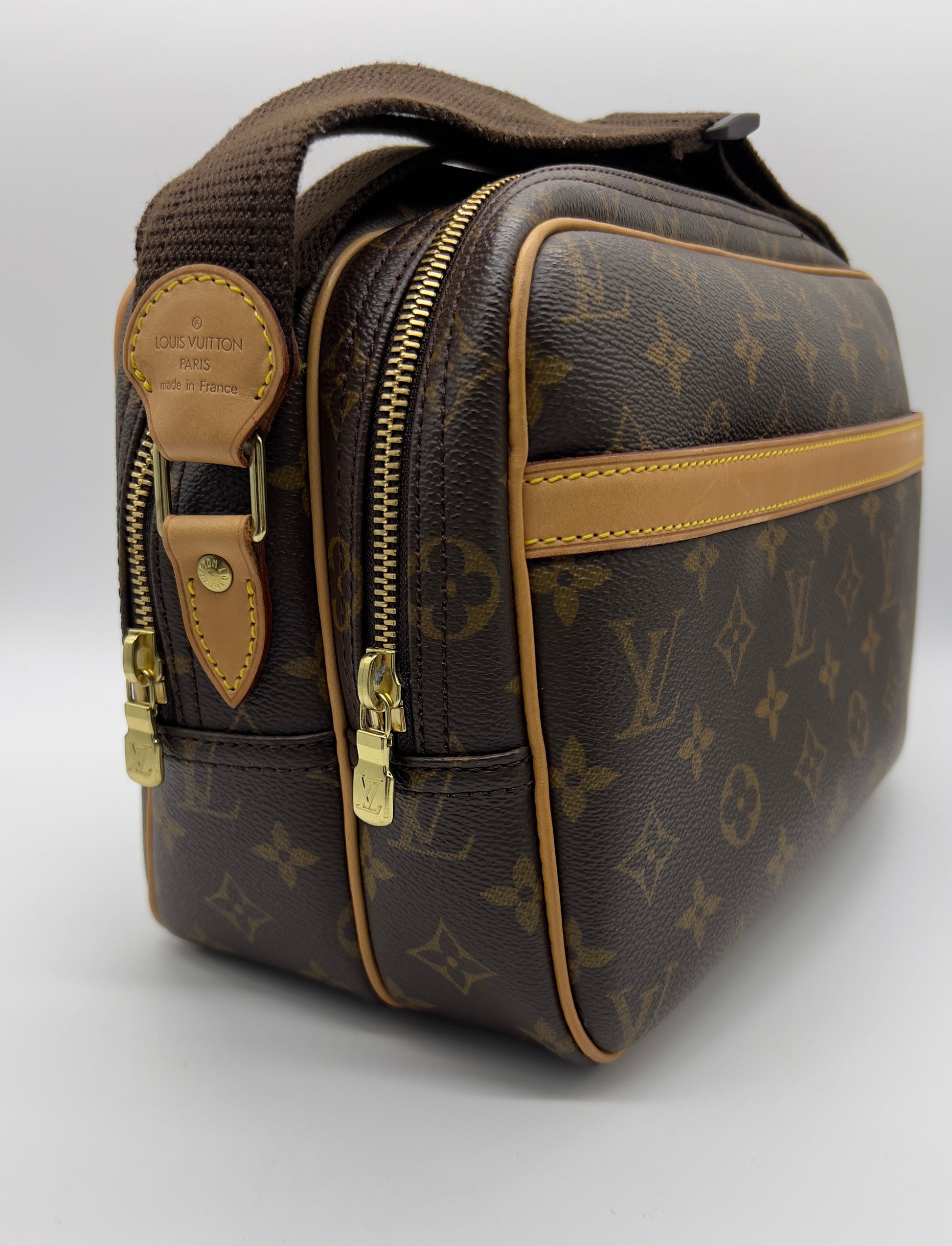This is a Louis Vuitton Monogram Reporter PM crossbody shoulder bag in brown coated canvas with Vachetta leather trim.
